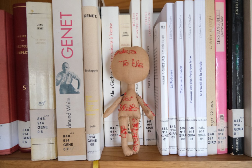 Broder de titres de livres sur des Dagalibri est un geste de soin, un geste magique, la lisibilité n’y est pas essentielle… Mais il peut m’arriver du chuchoter les titres – avec les noms de leurs auteurs – brodés sur les Dagalibri présentées…